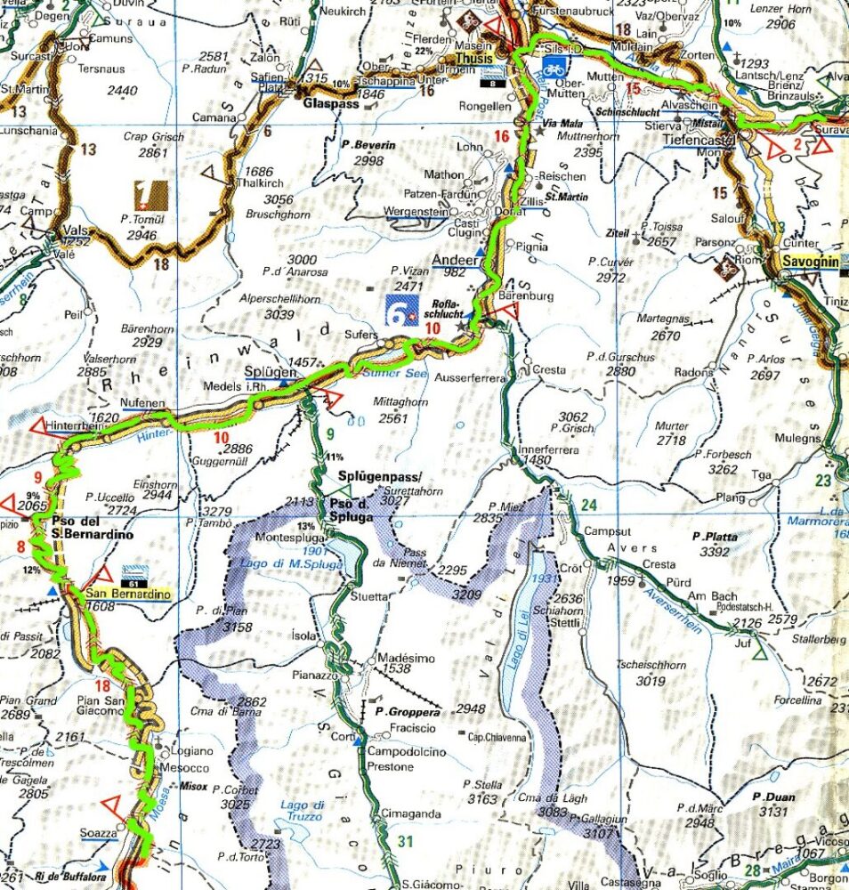 Budíme se do slunečného rána, i když v půl sedmé je sluníčko ještě za horami, ale je vidět modrá obloha. Bohužel fouká silný protivítr. Raději hned vyrážíme aby se nevrátil traktorista. Navíc jsme mu zanechali v lesíku za stodolou naší vizitku. Dorážíme do Soazzy (554m), ale do města ani nezajíždíme protože je vysoko na skále. Rovnou se pouštíme do stoupání, na 26km musíme vystoupat o 1500m výš. Při nejbližší příležitosti snídáme nakoupené housky a klobásky. Dál už je šlapeme do kopce proti větru. V Mesocco je stoupání dokonce proti větru po kostkách. Po pár kilometrech se před větrem schováváme a čekáme až vyleze sluníčko zpoza hor. Předpokládáme že se vzduch ohřeje a přestane foukat. Fouká sice pořád stejně, ale alespoň je trochu tepleji. Konečně dojíždíme do San Bernardina (1608mnm), posilňujeme se čokoládou a dáváme si dvacet na schodech před místním kostelem zahříváni sluníčkem. Čeká nás ještě dalších 9km a 450m převýšení. Cesta je sice úmorná musíme jet v mikinách, stále proti větru, často stavíme na focení nádherných scenérií, které se neustále mění a znovu nás uchvacují. V 12.30 konečně dojíždíme nahoru, Pso del S.Bernardino (2065mnm). Dáváme si v místní hospůdce Bigbeer, přináší nám pivo v lahvi jako od vína. Po chvilce relaxování se vydáváme na sjezd, je zima, pořád navlečení v mikinách brzdíme z kopce co ještě lze od sjetých brzd chtít. Musíme je vyměnit. Dojíždíme do Splügenu kde si chceme dát oběd v restauraci, ale objevujeme obchod který má otevřeno i v neděli. Poobědváme s výhledem na hory, 1/2 litrový domácí jogurt s croasanty a domácí klobásky. Pokračujeme ve sjezdu, někdy je potřeba vyšlapat kopeček až do Thusisu. Ten jen projíždíme a podle plánu odbočujeme stále po trase č. 6 na St. Moritz. Ve vesničce Tiefencastel, kde je jen kostel a pár domků a hospod si dopřáváme večeři. Rumpsteak a pivko za 46Chf. Sedáme na kola s plánem, že za Surravou najdeme místo ke spaní, vyrážíme dál. Poštěstilo se nám hned v Surravě, po sjetí z hlavní silnice objevujeme přístřešek ideální na přespání. Je to lepší kvůli rose. Je 21.00 a jdeme spát, zítra nás čeká Albulapass (2312mnm). Před usnutím nás ještě otravuje skupinka dětí, dělají si bojovku z toho, kdo k nám přijde blíž. Za chvíli ale přestávají prudit a my jdeme chrnět.