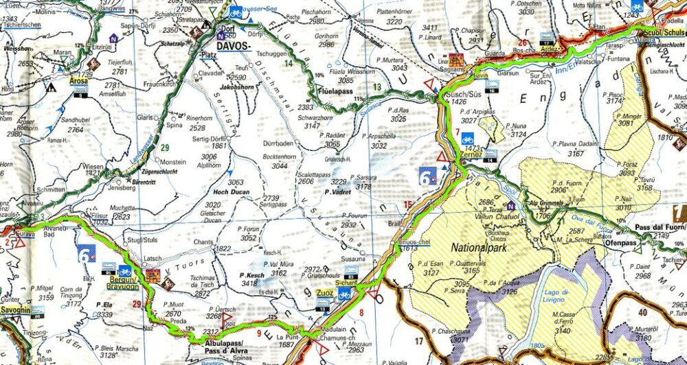 Vstáváme časně ráno. Bohužel zjišťuji, že spím na kamení, karimatka je sfouklá, uvidíme proč. Luďan zase zjišťuje, že jeho spacák v 8 o C nehřeje. Je úplně jasno, ani mráček, ale kosa! Navlékáme na sebe co se dá a vyrážíme zdolat Albulapass (2312m). Před snídaní kterou plánujeme ve 14km vzdáleném Bergünu jsme nuceni vystoupat něco přes 500m, takže se nám alespoň trochu přiblížil vrchol. Bergün je krásně malované městečko, snídáme před obchodem a vyhříváme se na sluníčku. K snídani osvědčená kombinace 1/2kg jogurt, broskve a croasanty z místní pekárny. Využíváme pohostinnost místní Bahnhoff a pak již v 10.00 vyrážíme k vrcholu. Cesta na Albulu je zase úplně jiná než na ostatní pasy. Proplétáme se mnoha zatáčkami pod kamennými železničními mosty. Cestou se předháníme s namakanou cyklistkou na starším silničním kole, která snad veze na nosiči celý dům.