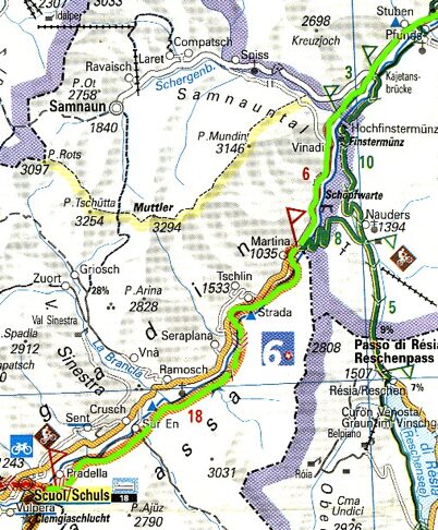 Ráno si přispáváme a sušíme na sluníčku spacáky od rosy. Vyrážíme směr k rakouské hranici do městečka Martina . Na hranicích využíváme pohostinnost místního obchodu a holíme se na WC. Sháníme také mapu naší další cesty Inn radweg ale prozatím ji nekupujeme. Chvíli čekáme na otevření silnice, kvůli nehodě motorkáře. Pak již vyrážíme přes švýcarskou hranici do Rakouska.