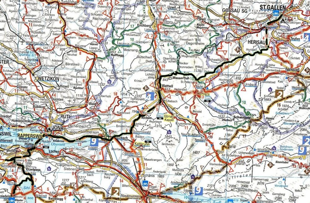 Do St. Galenu dorážíme v 5.00, snídáme housky od maminky a dáváme si na nádraží kávu, já na probrání, Luďan aby neusnul. Mapu prozatím nemůžeme sehnat, tak jedem podle ukazatelů, kterých je všude plno. Trasa 4 super tu potřebujeme a vyrážíme. Přes Galen, Stein Hundwill, Waldstatt cesta je to příšerná ale to už je nám oboum jasné že se někde stala chyba. Jedem sice po čtyřce ale turistické! Místama tlačíme kola do krpálu lesem a místama sjíždíme lesní cestou plnou kořenů. Sjíždíme do st. Petrzell a pak už raději po silnici dojíždíme do Wattwill kde se konečně napojujeme na naší cyklistickou čtyřku. Ve Wattwilu konečně kupujeme mapu. Sehnali jsme snad nejlepší mapu co byla k mání. Je to cyklomapa celého Sweiss 1:300.000 s vyznačením všech stezek, kempů, klesání výšek a všeho co potřebujeme.