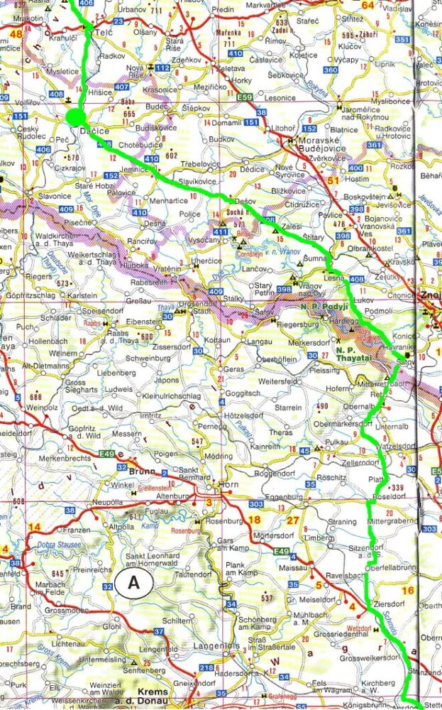 U pumpy kupujeme mapu ČR 1:500.000 a vyrážíme. Chceme projet národní park Podyjjí . Napojujeme se na cyklostezku Greenways Wien Prag. Zase pořádné kopce, ale kvalita stezky hrůza, jeden úsek musíme tlačit. Projíždíme asi 20km parkem, ale jsme nuceni zastavit v obci Lukov a schovat se na pivo. Od rána trochu cedí ale teď se rozpršelo. Dáváme dva „stropolezy“ a je po dešti. Pokračujeme dál, ale už po silnici, až do Dačic. Trochu litujeme že jsem koupili mapu v měřítku 1:500tis. Celou dobu máme 1:300 a jsem zvyklí na to že po ujetí určítého úseku se posuneme o pár centimetrů v mapě. V mapě ČR se však ujetá vzdálenost nijak neprojevuje a zdá se nám že jsme pořád na místě. V Dačicích parkujeme hned u prvního motelu za 390kč/os se snídaní – dobrá cena. Jdeme se najíst do města a popít českého pivka. Musíme se ale vrátit do 23.00 motel se zavírá.