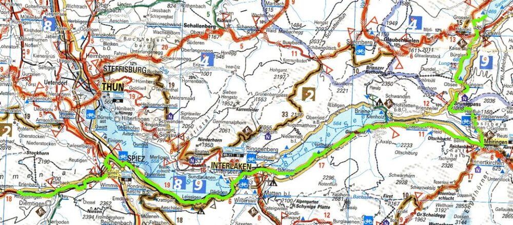 Ráno nám medvěd tentokrát jídlo nesežral, protože jsme ho večer umístili na vysoký sloup, ale někdo v noci posral kámen, vedle kterého jsme se vzbudili. K snídani dojídáme jogurt a v 7.00 už vyrážíme do kopce z kempu v Giswillu (470mnm) k nádhernému jezeru Lunger-see (689mnm), objíždíme ho lesem a stoupáme dál vedle trati. Jakmile je mezi kolejemi zubačka víme, že nás nečeká žádná rovina. Dorážíme do Brüning pasu (1008mnm) a přes Hasliberg (1051mnm) na vrchol. Na pár kilometrech jsme nastoupali 581m!. Teď konečně pěkný sjezd do městečka Meiringen (598mnm). Projíždíme údolím mezi horami, které jsme obdivovali z Brüning passu, když jsme nad ním projížděli. Kocháme se mnohými vodopády, padajícími z vysokých míst skal skoro až do údolí. Následuje prudký vejšlap, lesem kolem vodopádu, který si procházíme i pod padající vodou sjíždíme k jezeru Brienzer See (564mnm). Jezero má nádherně modrou vodu, je 35oC tak smáčíme naše těla a sušíme propocené věci. Teplota vody odpovídá tání alpských ledovců na rozdíl od teploučké vody v Giswillu. V městě Interlaken které leží mezi dvěma jezery nakupujeme v Coopu oběd, večeři i snídani na další den. Zítra je neděle a všude bude zavřeno. Před Coopem kolem 14.00 obědváme jogurt s čokoládou, využíváme místní Swiss Bahnhoff (za jejichž pohostinnost a čistotu WC bych chtěl poděkovat) a vyrážíme dál. Po pár kilometrech nás ale potkává prudký liják z vedra, tak usedáme na zahrádku na jedno ovesné pivo servírované blondýnkou v bikinkách. Pozorujeme paraglidisty jak se snaží v bouři přistát a vyhnout se tak střetu s bleskem. Během pár minut liják ustává a vyrážíme na cestu tentokrát spíš po silnici kolem dalšího jezera Thuner See (558mnm) přes městečko Spies kde odbočujeme doleva do hor směr Oey. Začíná se to trochu zatahovat, nasazujeme tempo a v poslední chvíli proti větru dojíždíme na nádraží. Spouští se neskutečný slejvák s krupobitím. Zvažujeme možnost přespat na nádraží v podchodu, ale po hodině přestává pršet tak jedeme dál. Kousek od nádraží je kemp ale cena je opět dost vysoká 32Chf za stan. Míříme tedy dál po naší trase až do městečka Erlenbach. Začíná zase trochu cedit tak přemítáme o přespání v místní fabrice, ale nakonec tavíme stan těsně vedle cyklostezky u řeky a trati J. Je 19.30 pořád prší, ale už máme stan postavený, můžeme se tedy navečeřet a jít chrupat. Snad bude zítra svítit sluníčko. 21.00 dobrou noc.