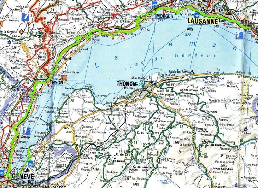Ráno se budíme do teplého dne a hned vyrážíme. Snídani kupujeme až v nedalekém Laussane snídáme v parku a pokračujeme dál po břehu jezera směr Ženeva. Cesta nás vede místy dál od jezera, v Morges stavíme v cykloobchodě a kupujeme šroub do Luďanových zámků na botech. Někde ho vyklepal a nemůže sundat nohu ze šlapky. Procházíme krásné městečko St Prex a projíždíme vinařskou oblastí Perroj, relativně po rovince konečně dorážíme k ceduli Geneve. Zjišťujeme, že v Ženevě chcípnul pes, až na vodotrysk stříkající do 150 m výšky a pláže, které jsou vybudované na poloostrovech přímo ve městě, tu nic moc není. Pláže jsou placené, což vylučujeme. Plánujeme si někde sednout na pivko, ale všude mraky lidí. Sháním někde pohled abych napsal domů, ale nikde nic není, ani krámek, jsme odkázáni na poštu, což je asi 5km zpátky do centra proti větru. Nakonec se tedy vracíme, poštu v centru nalézáme skoro okamžitě a už můžeme tentokrát po větru pokračovat v objíždění Ženevského jezera. Z města velice rádi vypadneme, máme v plánu zakotvit zase na nějaké pěkné veřejné pláži. Ještě kupujeme fazolky a buřty na večeři. Pláž je tu jen jedna – Bellerive. U pláže na hodinku zakotvíme v hospůdce na pivko a pak už přemýšlíme, kde se vyspíme. Začal foukat pěknej vítr a začíná se trochu zatahovat. Koupeme se ve vlnách jezera jako v moři a poté na lavičce vaříme fazolky s nakrájenými buřty. Na pláž chodí spoustu lidí a jen tak na zemi rozdělávají ohníčky z dřevěného uhlí a pečou maso, buřty a já nevím co ještě. Neodradí je ani to, že se začíná stmívat, fouká vichr a začíná trochu poprchávat. Uvelebujeme se na dvou lavičkách jen tak na karimatkách bez spacáku a doufáme, že se nerozprší. Usínáme zas ve 22.00