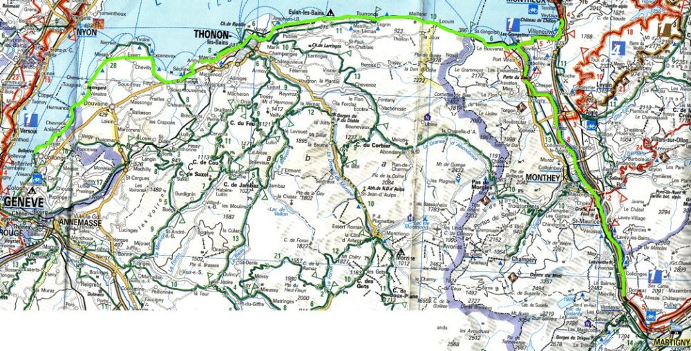 Dnes vyrážíme v 7.30. Trochu jsme si pospali. V noci naštěstí nepršelo a na lavičce se na karimatce leželo OK. Akorát k ránu bylo potřeba ohřát nohy a vytáhnout spacák. Cesta kolem Ženevského jezera po jeho spodní straně je ještě víc pohotovější než trasa č.1. Je to sice většinou po silnici a na území Francie ale skoro po rovince. Poslední úsek dokonce těsně kolem vody. Snídáme trochu ze zpožděním až na konci Thononu v 11.30 po 40 km jízdy. V supermarketu kupujeme snídani, ale je to skoro i oběd. Pokračujeme dál přes krásně upravené a zjevně bohaté městečko Evian (výrobce vody). Přejíždíme francouzko švýcarskou hranici, zastavujeme , ale celník mávne rukou abychom jeli dál. Po přejetí hranice pociťujeme značný rozdíl v kvalitě asfaltu a po pár metrech začíná opět značená cyklostezka na silnici. Je vidět že Švýcarsko je pořád o něco dál. Dojíždíme do Le Bouveret kde si dáváme první studené pivko a nabíjíme telefon. Napojujeme se na naší trasu č.1 po které budeme pokračovat směr jihovýchod. Děláme ale malou zajížďku ještě kolem jezera, abychom si prohlédli vodní hrad Chillon a Montreux. Je 41 stupňů tak se ještě naposledy koupeme v Ženevském jezeře. Teď už definitivně šlapeme po trase č.1 směrem na Martigny. Je to opět pohodová cesta kolem řeky, sice proti proudu, ale po krásné cestě. Na obou stranách nás začínají uzavírat hory. Hledáme na poslední chvíli v St.Maurice obchod a nakupujeme tentokrát studenou večeři – paštiku, sýr, chleba a pivko. Teď už bez starostí šlapeme a vyhlížíme místečko na přespání. Asi 1 km před Martigny míjíme u řeky plácek s ohništěm a levičkami, který ihned obsazujeme. Chladíme pivko v řece a večeříme pod skálou na které do setmění pozorujeme horolezce místo televize. Je 21.30, dneska to opět vypadá bez deště teplo 25,6 tak uléháme do trávy opět pod širákem.