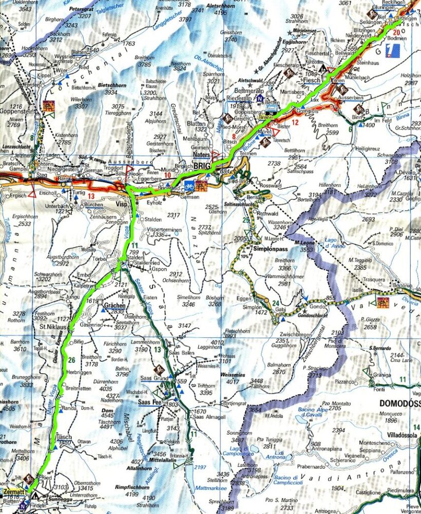 Dnešní ráno se probouzíme na zahrádce hospody s výhledem na Matterhorn. Musíme rychle balit, protože už se objevují první hosti, je totiž 9.30. Večer se trochu protáhl, v místním IRISH PUBU příjemná obsluha nás donutila vypít několik piv navíc dokonce i kořalku, nechápem to asi nám museli do pití něco přidávat asi alkohol. Matterhorn se nám ukazuje až při odjezdu z Zermatu, na chvíli vylézá z mraků alespoň na jedno foto. Sjíždíme několik km z kopce a na krásné loučce u vodopádů další hodinu dospáváme a ohříváme se sluníčkem pod jasně modrou oblohou. Ve 12.00 už definitivně šlapeme dolů na Visp, bohužel fouká opět protivítr, takže musíme i z kopečka šlapat. Ve Vispu jsme až ve 14.00 kde snídáme jogurt. Po pozdní snídani vyrážíme opět po naší trase č.1, tentokrát už s větrem v zádech přes městečko Brig mírným stoupáním, které se místy mění na pěkný krpál přes Lax a Filsch kde kupujeme klobásky k večeři s tím že je někde ugrilujeme. Po 10km nalézáme nádherné místo pro náš kemp, se stolem lavicemi, grilem, vodou, prostě super lepší to být nemůže. Luďan připravuje klobásky na grilu a já holím svůj devíti denní fous. Je 20.00 a ukládáme se k spánku, já pod stromem, Luďan na stole – přijde mi to pro mne bezpečné neboť medvěd v této výšce bude jistě hledat svačinku naservírovanou nejdřív na stole. To jestli jsou zde medvědi nevíme, ale můžeme o tom alespoň před usnutím přemýšlet.