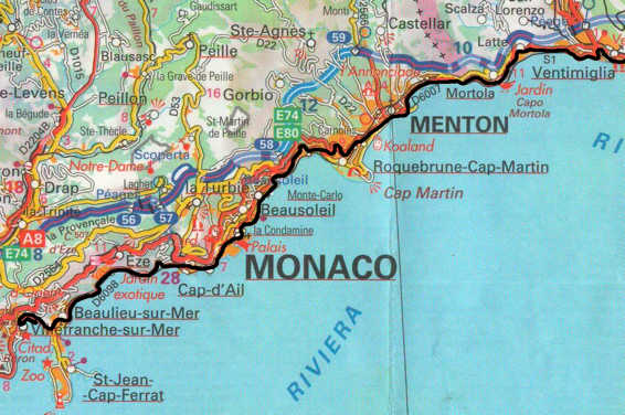 Vstáváme do slunečného dne až v půl deváté.Ve Villéfranche kupujeme v pekárně každý dva koláče, jeden s pudinkem, druhý s jablky a jíme je hned vedle v kavárně k ranní kávě. Kolem 11.00 přijíždíme do Monaka. Monako zabírá celkem 2,5km2 z toho půl kilometru na moři. Všude jsou nadjezdy a tunely. Vjíždíme do jednoho tunelu kde je dokonce kruhový objezd a sjíždíme tunelem do nejnižší části Monaka k vodě. Procházíme přístav, růžovou zahradu. V parku jsou tu dokonce jezdící schody pro pohodlí návštěvníků, těmi se opět dostáváme nahoru a dalším tunelem vyrážíme dál. Projíždíme částí dráhy kde se jezdí závody F1 – známým tunelem, proslulou Monackou zatáčkou a už se snažíme z Monaka směsicí podjezdů, mostů a tunelů vymotat na Menton. Tam se chladíme v moři a o kus dál v pizzerii obědváme každý jednu pěknou pizzu. To už máme na dohled Itálii.