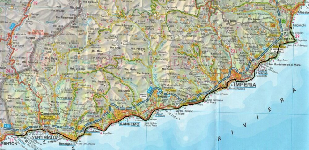 Hned v prvním městě za hranicí, ve Ventemíglii zastavujeme v knihkupectví a vybíráme z několika druhů map Itálie. Našli jsem pěkně barevnou automapu v měřítku 1:200.000 a na celou Itálii nám stačí pouze dvě. Berem a jedem. Cyklostezky v Itálii zatím ale nikde. Cestou zastavujeme na Italskou zmrzlinu a v Ospedaletti se koupeme na veřejné pláži plné kamenů. V Itálii jsou na rozdíl od Francie skoro všechny pláže placené nebo patří k hotelům až na vyjjímky které nestojí za nic. Čeká nás ale překvapení – hned u pláže v Ospedaletti najíždíme na cyklostezku všech cyklostezek. Dva pruhy plus třetí pro chodce, každých pár set metrů lavičky s pítkem. Cyklostezka je vytvořená místo staré železniční trati, takže se projíždí pod spoustou mostů a tunelů. Jedním osvětleným tunelem projíždíme 2km. Celou cestu podél moře po rovince, celkem 30km po krásném asfaltu až do San Lorenzo al Mare, ale bohužel proti docela silnému větru svištíme po téhle cyklodálnici. Ve městě Imperia zastavujeme v Carefouru a kupujeme k večeři těstovinový salát dvě hrušky a hned před obchodem večeříme. Pak už jen najít místo ke spánku. Projíždíme Diano Marina, San Bartolomeo al Mare až do Andory. Už je pozdě tak odbočujeme z cesty na pláž a jedeme kousek zpátky na kraj města, kde tušíme veřejnou pláž a trochu klidu. Taky že ano, skáčeme do dvoumetrových vln, půlhodiny jezdíme na vlnách a vyplachujeme nosní dutiny. U místního stánku dáváme pivko a těšíme se na klidnou noc. Je tu pár lidí a ty snad brzy půjdou spát. Za stánkem je pěkná travnatá plocha. Během chvíle přijíždí z města vláček a vystupuje lidi, to se několikrát opakuje a my jsem snad na nejrušnějším místě ve městě. Je 22.00 a 24stupňů.