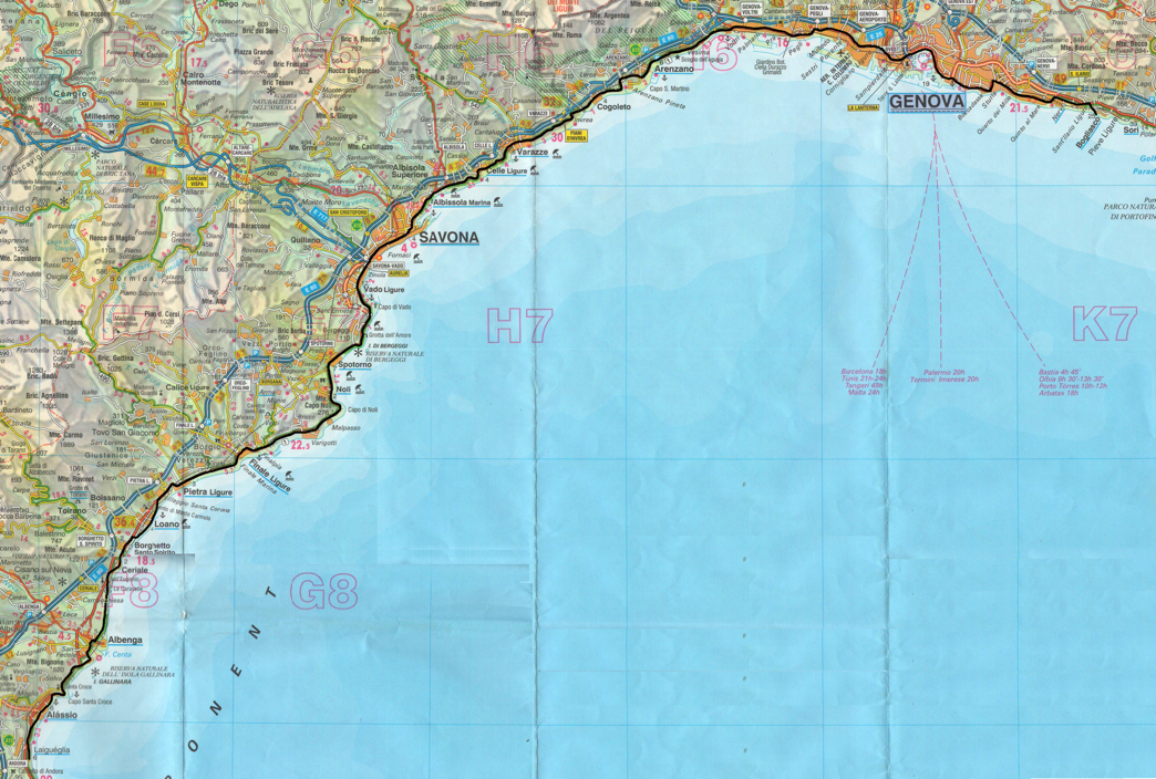 Naštěstí šla většina lidí kolem půlnoci spát – zavřeli stánek. Ráno se budíme ale ještě asi půl hodinky dospáváme. Ve městě v kavárně snídáme výborné čokoládové croassanty s kávou a domlouváme se servírkou i možnost oholit dvanáctidenní fous na WC. Už jsem se naučili projíždět Italskými městy a přizpůsobili jsem se stylu místních motorkářů na skútrech. Je to cvrkot ale žádnou bouračku jsem neviděli. Vyrážíme z Andory přes Alássio, Albenga, Loano až do Savony kde vybíráme pizzerii a pláž. Pizza výborná olivový olej pěkně pálí. Koupeme se na pěkné pláži a chvíli se sluníme, ale přichází místní Bjukenen a upozorňuje nás, že tato pláž není pro lidi? Ok musíme vypadnout ale ještě použijeme rychle sprchy a chceme jet. Odemykáme kola a zjišťujeme že Luďan má jedno kolo prázdné. Napadá nás pomsta Miče. Měníme duši a díru lepíme. Díra byla ale zevnitř ráfku, takže sabotáž neb defekt vylučujeme. Chyba bude buď v únavě materiálu nebo na straně Michla a úpravy vnitřní strany ráfku. Frčíme dál směr Genova. Cestou stavíme na koupání a zmrzlinu. Genovou projíždíme v podvečer a snažíme se co nejdřív z města dostat. Doprava ve větších městech je dost nahuštěná a neustále kličkujeme mezi auty v zácpách. Stavíme jen v přístavu a obdivujeme repliku staré plachetnice. Kousíček za Genovou v Nervi kupujeme u staré paní v krámku na večer vínko s tím že povečeříme v restauraci. Ve městě Bogliasco odbočujeme a sjíždíme k moři. Ve městě je pláž a maličký přístav s betonovým molem, snad bude kde spát. Na pláži se koupem, převlékáme a jdeme na večeři na pizzu do podniku Glipper. Pizza sice dobrá ale obsluha příšerná. Číšníci nepřicházejí, čekáme asi hodinu na jídlo, 3x objednáváme olivový olej. Od vedlejšího stolu se zvedá otrávený pár a odchází, hlavní chod pořád nikde. Majitel podniku se snaží běhá a slibuje. Po třičtvrtě hodině čekání na účet už nevydržíme ani my a odcházíme pryč. Je 22.00 jsem po večeři, jdeme najít místo na spaní a dát si před usnutím dobré Italské vínko. Teplota je příjemných 24stupňů.