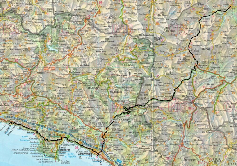 Ustlali jsem si na betonovém molu vedle zaparkovaných lodí. Noc bez problémů, šumění moře nás uspalo a ráno nás probouzí sluníčko v 7.30. Balíme a hned vyrážíme na cestu. Na snídani stavíme až v Recco. V kavárně kávu a croassant, tentokrát s pudinkem a naproti v pekárně ještě dva koláče s marmeládou. Stoupáme přes horu poloostrova Portofino a hned zase sjíždíme dolů do Rapallo. Do Chiavari jedeme pořád na dohled od moře na úpatí skály, ale je to jak na houpačce, nahoru –dolu, ještě že tu jsou občas tunely, které zkracují stoupání a cestu přes výběžky do moře. Dorážíme tam před polednem, projíždíme město a na poslední pláži před odbočením do hor se naposledy koupeme v moři. Pláž veřejná – tudíž katastrofální, na zemi špína, písek – černý prach, ale moře je stejné jako všude a potěší sprcha. Pereme ponožky, dresy a vyrážíme do hor. Přes Carasco do Mezzángo je to pořád nahoru a dolu ale stále ve stejné výšce. V Carasco stíháme ještě otevřený supermarket a obědváme hned vedle na schodech rozpékací housky (normální už neměli) se salámem a lososem. Chceme ještě dát po obědě zmrzlinku. Těsně před stoupáním se na nás usměje štěstí a v Mezzánego si pochutnáváme na grande porci v nově otevřené Gelaterii. S jednou zastávkou na doplnění vody, po hodině a půl šlapání do kopce zdoláváme Passo di Bocco 956mnm. Sjíždíme 25km do města Bedónia a zase 300 výškových metrů do kopce do dalšího passu di Monteveca ve výšce 805mnm. Pak zase dolů až k mostu přes řeku Ceno ve výšce 500mnm. Poslední kopec nás čeká právě od mostu do města Bardi, kde jsme se rozhodli povečeřet a přenocovat. Už při příjezdu do Bardi fotíme veliký hrad. Do města dojíždíme v 19.30 a hned hledáme místo na spaní. U hradu je spousty různých zákoutí, takže dneska bude noc přímo v podhradí. Na večeři jdeme do jediné pizzerie ve městě s názvem „Pelicano“, dáváme si sýrovou pizzu a jsme nadšeni. Rychlostí, obsluhou, dobrou pizzou, dobrým vínem a živou hudbou, která nám celý večer pěkně hraje. Teda je to jeden klávesista ale dobrej. Je 21.30 teploučko 24,6 stupňů a my zaplatíme a půjdeme spát.