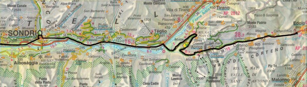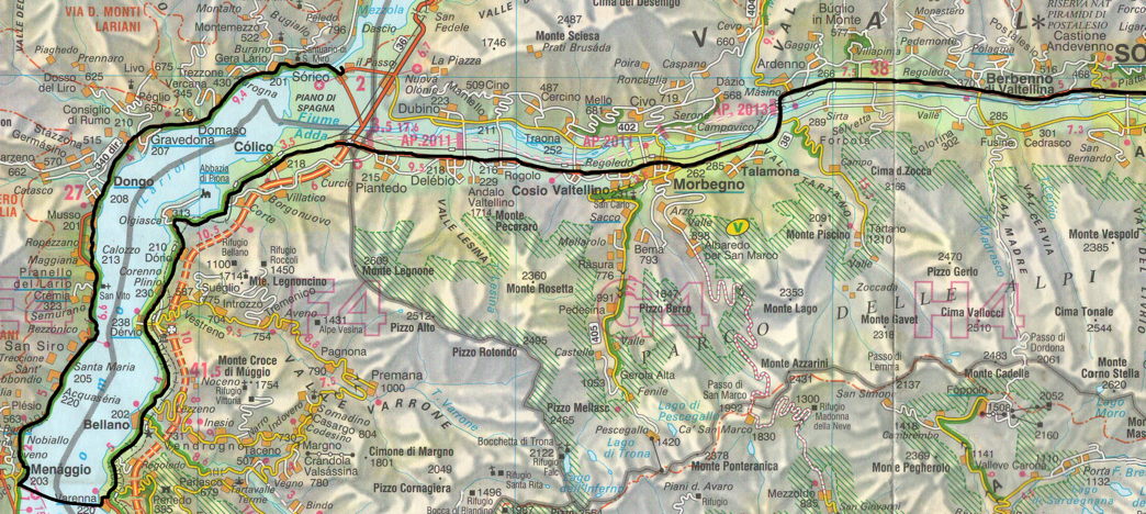 Krásná noc na madraci končí, den začíná sluníčkem a my vyrážíme hned do kopce směr Pass Aprica. V první vesničce Cortonedilo snídáme naší oblíbenou kombinaci, kávu, jogurt, croasant a banán. Kolem prochází pěšky muž, z Vintemíglie. Prý jde přes Alpy. Kárku (dvoukolák) veze za sebou a přidržuje jednou rukou, ale asi pořád, protože jí má nesouměrně větší než tu druhou. Tři kilometry před passem Aprica, který je celkem snadný, stoupáme na něj pozvolna 15km, začíná opět pršet. Jedeme dál ale kilometr před cílem musíme zase zalézt a čekat až přejde to nejhorší. Na passu del Aprica nemají ani ceduli s výškou 1200mnm. Sjíždíme dolů a už vylézá sluníčko, jsme stále nad mraky a pozorujeme vesnice dole které mraky obklopují. Dolů to trvá o něco déle než obvykle. Mám už sjeté zadní brzdy, tak se to bojím trochu víc pustit. Po 14km sjezdu už pokračujeme dalších 55km údolím mezi horami, mírně z kopečka směr jezero Como. Fouká trochu protivítr ale jede se nám dobře.