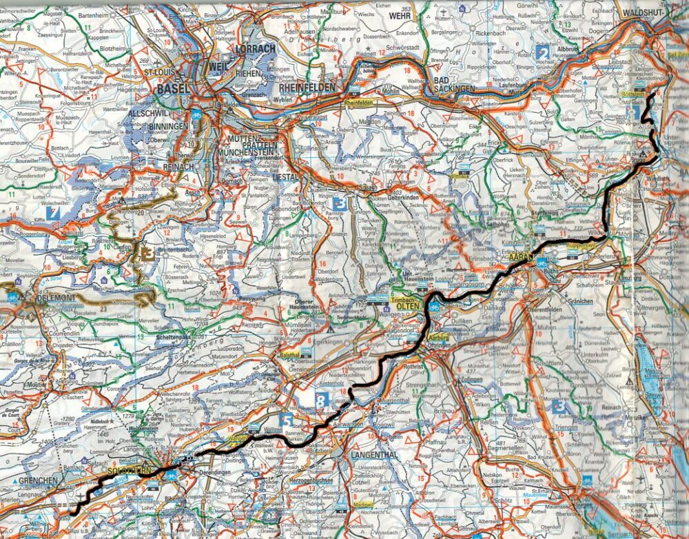 Vstáváme kolem půl sedmé, noc proběhla bez problémů, ovce se pásly opodál a neobtěžovali. Provádíme ranní koupel v 25 stupních spojenou s vypuštěním kočičáků. Opouštíme tábor a vyrážíme na cestu. V první vesničce Villigen snídáme jogurt a sýr. Dnešní den se snažíme najet co nejvíc kilometrů než začne pršet. Podle předpovědi www.yr.no má začít kolem dvanácté hodiny. Těsně za Villigenem na naší trase je nádherný přístřešek s grilem – škoda, ale to člověk nemůže večer vědět a bere to nejlepší co je. Projíždíme Brugg a Aarau. Těsně za městem u menší přehradní elektrárny musíme v 10hodin zastavit a schovat se před deštěm. Je tu technická budova s přístřeškem pro auto. Pracovník nás zve dovnitř do tepla, dokonce nám ohřívá v konvici vodu na instantní polévku. Za hodinku přestává pršet tak pokračujem dál po naší trase „č.8“. Hned za mostem je další krásný přístřešek s lavicemi a stoly kde by se dalo schovat i přespat. V Oltenu kupujeme oběd, standardně –sýr, salám, chleba, kilo nektarinek a čokoládu. Už se nám to trochu přejídá. Další místečko se střechou na přespání míjíme kousíček za Boningenem ale vzhledem k tomu že zatím neprší jedeme dál. Déšť nás dostihl před městečkem Wolfwill místní tu pořádají nějaké závody, tak jsou tu připravené párty stany, využíváme toho a malou půl hodinovou přepršku krátíme rychlým spánkem. Projíždíme Solothurn kde nakupujem na večeři sýr, párky, hořčici a pivko na večeři. Teď už se můžeme soustředit jen na hledání vhodného přístřešku na přespání. Podjíždíme most pod dálnicí který zamítáme a po pár kilometrech narážíme na jacht club u městečka Grenchen. Je tu molo na vykoupání, záchody, lavičky kde vaříme večeři a hospůdka kde teď sedíme a doplňujeme tekutiny. Spát budeme buď pod přístřeškem u záchodů a nebo pod přístřeškem jacht clubu, pokud tam nikdo nebude. Je 20.00 a 23 stupňů.