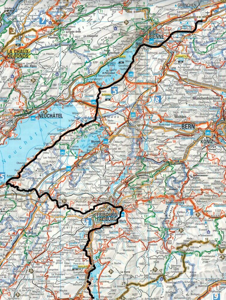 Noc jsme strávili v přístřešku u WC, v jacht clubu bylo rozsvíceno. Od půlnoci do rána byl pořádný slejvák, takže super spaní v suchu. Ráno vyjíždíme v 7.30 a snídáme v první vesnici Büren a.A. , frčíme směr Biel, městem neprojíždíme, cyklotrasa naštěstí vede okolo. Dorážíme k prvnímu ze dvou velkých jezer Biele see. Jezero objíždíme opouštíme trasu č.8 která odbočuje na Bern a dál pokračujeme ještě kousek po pětce. Na konci jezera volíme zkratku která nám šetří 10km a přejíždíme kopec do Ins. Na vrcholu v lese míjíme přístřešek z grilem a lavicemi, kdybychom takový mohli najít večer. V Ins se zase napojujeme na pětku a místní zemědělskou krajinou objíždíme druhé jezero Lac de Neuchatel, které 20km ani nevidíme. Až na oběd ve 13.00 v městečku Estavayer le lac sjíždíme přímo k jezeru abychom se alespoň u vody najedli a jezero poprvé prohlédli. Losos se sýrem a rajčátky je trochu změna a plánujeme další směr cesty. Buďto přes Yverdon pořád po pětce až k ženevskému jezeru do Lausanne nebo opustit pětku a přes Freiburg přes hory rovnou do Martigny. Pod heslem „je to sice dál, zato horší cesta“ vybíráme Béčko. Cesta do Freiburgu je trošku kopcovitější, ve Freiburgu chceme nakoupit na večeři ale nakonec se snažíme z města co nejdřív vypadnout kvůli provozu. Naštěstí po půlhodině hledání a ježdění nalézáme trasu č.4 po které jedeme dál a na večeři nakupujeme až v Aldi v městečku Marley. Buřty a klobásky na opékání, okurky a Chardonay Italy 2010. Plánujeme jet až nalezneme gril někde u jezera před Bulle. Jezero Lac de La Gruyere je nepřístupné ze všech stran, snažíme se dostat ke břehu ale všude jsou buď skály nebo nepřístupný les. Už si myslíme že to vzdáme a pojedeme dál. Je 20.00 a stoupáme do městečka Morlon. Z výšky se nám zdá, že dole u jezera je pláž, chvíli přemítáme a nakonec sjíždíme 100 výškových metrů k jezeru. Pláž se spoustou ohnišť je prázdná jen u jednoho ohýnku sedí dva Švýcaři a již po jídle popíjejí víno a klábosí francouzsky. Jeden menší a černoch hromotluk něco jako z filmu Zelená míle. Snažíme se s nimi dorozumět a zjistit zda nám od nich nic nebude hrozit, jak po stránce kriminální tak sexuální. Nakonec na jejich ohni opékáme buřtíky a v jejich lednici chladíme víno na večer. Je trochu pod mrakem, máme obavu z deště ale snad nebude. Švýcaři už odešli dom, nechali nám hořet ohýnek a my půjdeme spát. Je 22.00 a 18,7 stupňů, fouká vítr ale schováme se za kmen stromu které tu leží místo laviček na sezení.