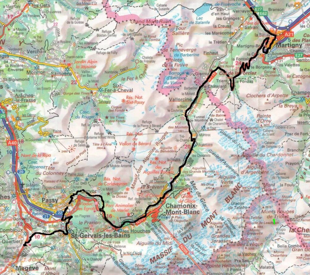 Spaní vynikající. Vyrážíme tak, abychom v 8.00 stihli otevření obchoďáku v Martigny. Snídáme a chystáme se na zdolání dnešních kopců. Odbočujeme směr Francie a vyjíždíme do prvního stoupání nad město. Kopec má místy až 12% sklon. Cestou děláme dvě zastávky, jednu v půlce abychom se posilnili čokoládou a druhou po další hodině kvůli focení, již kousek od vrcholu Col de la Forclaz v 1526mnm, pass zdoláváme po 3 hodinách šlapání . Cesta pohodová , celou dobu po silnici, což jsem předpokládali. Nahoře dáváme na zahrádce pivko a hned sjíždíme dolů směrem na Chamonix. Na Švýcarsko francouzské hranici se kopec opět lomí nahoru a my vyjíždíme ten den už druhý pass Col de Montets ve výšce 1461mnm. Fotíme z dálky Mont Blanc 4810m a pak už pěkně z kopečka kolem trčících se čtyřtisícovek ze kterých odtávají ledovce padáme do Chamonix. Cestou mnohokrát stavíme kvůli focení, naskýtají se nám nádherné scenérie vysokých hor. V Chamonix v 15.hodin kupujeme a hned hltáme francouzský sýr, paštiku a begetu k obědu. Další asi dvě hodiny sháníme po celém městě cyklomapu Francie. Posílají nás z jednoho obchodu do druhého a nakonec kupujeme dvě automapy v našem vyhovujícím měřítku 1:200 000, které nás dovedou až k moři a dál po pobřeží až do Itálie. Konečně v 17.30 vyrážíme dál. V mapě, kde nejsou značené cyklostezky se ještě moc neorientujem, musíme se několikrát ptát. Francouzi jen Francouzsky tak rukama a s mapou. Ono jsme zjistili, že ve Francii ani asi vůbec žádné cyklostezky nejsou. Sjíždíme konečně na vedlejší silnici správným směrem, ale po pár kilometrech cesty z kopce zjišťujeme že je slepá a končí u dálnice. Co se dá dělat, přehazujeme kola přes svodidla a asi 5 km mastíme po dálnici. Naštěstí v tomto úsek je to z pěkného kopce takže bez šlapání to máme hned za sebou. Sjíždíme na vesničku Servoz a pěkně lesem uháníme směr Passy. Passy je rozsáhlé město pokrývající velké údolí mezi horami a my vůbec nevíme jak ho projet. Volíme způsob pořád za nosem a nakonec zjišťujeme že jsem vybrali nejlepší variantu. Sjíždíme první odbočkou dolů do čtvrti Chedde, projíždíme celým městem pořád rovně a pak stoupáme přes Les Plagnes až do St-Gervais-Les-Bains. Tam pět minut po osmé nakupujeme v obchůdku Sherpa večeři. Máme štěstí mají mít už zavřeno, ale ještě nám prodají konzervu Chilli fazolek, sýr a sladký toustový chléb. Sedáme na kola a stoupáme pořád výš a výš skoro až do Megévé. Zastavujeme 3km před městem a hledáme vhodné místo na spaní je už 21.00, tak je na čase. Ubytováváme se pod přístřeškem, kde se v zimě prodávají lístky na lanovku. Vaříme fazolky, zapíjíme a zajídáme dobrým francouzským vínem a sýrem. Nikde ani mráček, pršet určitě nebudem ale je docela chladno už se těšíme do spacáků. Je 23.00 a 13 stupňů.