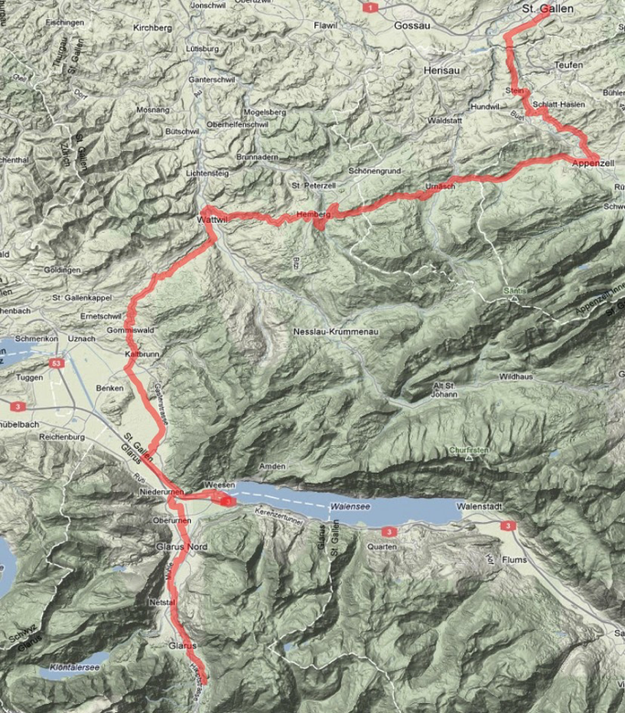 Vstáváme v 5.00, tedy jen ti kdo spali, tedy já. Jak je již zvykem, převlékáme se v nádražním WC, dáváme ranní kávu a v 6.30 již dupeme do pedálů směr první kopečky před Stejnem. Již jsme tudy projížděli před dvěma lety, ale ve Stejnu jsme špatně odbočili na turistickou stezku. Tentokrát máme již mapu, takže bez problémů dorážíme do městečka Appenzell – projíždíme hlavní třídou a obdivujeme krásně malované dřevěné domy z 18 století. Appenzell je pověstný sýrem Appenzeller, který se vyrábí ve zdejší sýrárně z nepasterizovaného mléka už 700let. Z Appenzellu do Wattwillu je to z kopečka do kopečka, cestou překonáváme první převýšení v Osterbüel 1068mnm, což zajídáme výborným jogurtem. U Hembergu si Monika dospává noční deficit na místní zastávce. 20 min. na oživení stačí a už sjíždíme do Wattwilu, kde nakupujeme zeleninu k našim objedovým řízkům, které si vezeme ještě z domova. Ty ale objedváme až po zdolání 200m převýšení u městečka Rockem. Konečně vychází sluníčko a trochu se po obídku vyhříváme. Prozatím bylo pod mrakem kolem 13 stupňů a trochu mrholilo. Z Rickenu frčíme z kopečka až k jezeru Walensse. Tady podle plánu možná nalezneme místo ke spánku, ale nenalézáme. Jediná pláž ze západní strany jezera je celkem špinavá. Zvažujeme ještě jestli nezajedeme do vesničky Amden, v jejíž blízkosti se nacházejí dvaadvacetimetrové vodopády Seeren- bachfälle. K vodopádům je to ale asi 5km do kopce, takže se nakonec vracíme a odbočujeme ve směru naší další cesty po trase č.4. Hned v Niederurnenu v obchoďáku nakupujeme na večer a doufáme, že cestou do Linthalu, kde začíná stoupání na Klausenpass, najdeme nějaké místečko ke spánku. Po 15km máme štěstí, před Schwandenem u řeky kotvíme u opuštěného srubu. Je tu terasa se střechou, nic víc nepotřebujeme. Dojídáme řízky z domova a popíjíme růžové vínečko Syrah Rosé. Máme totiž dnes 17té výročí svatby. Před chvílí přijeli do srubu nějaké dvě ženské, ani se neohřáli a vyrazili na procházku, auto tu nechali. Doufáme, že budou v pohodě. Čekáme až přijdou a odjedou abychom mohli hajat. Je 21.00 a 21,3 stupňů.