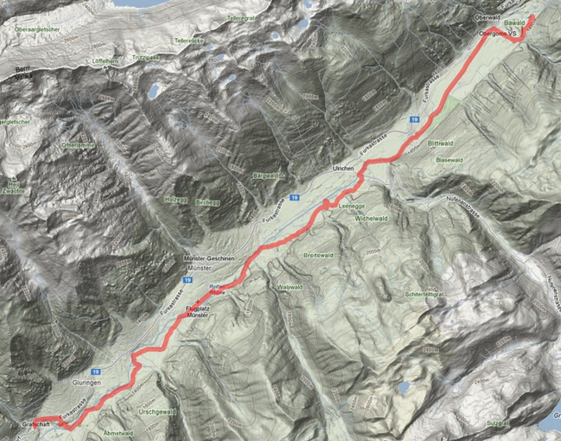 Vstáváme až v 8.00, venku bohužel prší, ale doufáme že to přejde. Snídáme opečený chlebík s klobáskou a gorgonzolou a zapíjíme překapávanou kávou. Vyrážíme až v 11.00, když se déšť trochu zmírnil. Čeká nás cesta po proudu řeky Rhony, takže by to mělo být z kopečka. Po sedmi kilometrech začíná opět pěkně pršet a my nechceme moknout. Cyklostezka je moc pěkná, ale musíme se někde schovat. Zajíždíme rychle k přístřešku u velkého hangáru, kde se schovává už celá třída dětí, také na kolech vyrazili na výlet. Po hodině to učitelé vzdávají a ženou děti zpět. Vaříme polévku a objedváme sušené maso. Kolkem druhé hodiny déšť trochu ustává tak vyrážíme dál. V dálce vidíme že by snad mělo být trochu jasno. Ne nadlouho, před Reckingenem začíná opět lejt. Zase čekáme pod přístřeškem v kmepu asi hodinu než můžeme pokračovat dál. Už toho máme dost a rozhodujeme se, že to někde zapíchneme. V kempu Brigga v Ritzingenu se ptáme na ubytování. Pro dvě osoby v karavanu za 35chf. Bereme !, ale ještě zajíždíme do nedalekého městečka Biel do krámu. Brambory, vajíčka, sýr a špek na večeři a honem zpátky ubytovat se. Příjemný pan domácí nám vaří kávu, točí pivo a nabízí malou kuchyňku, abychom mohli uvařit. Děláme si míchaná vajíčka se sýrem. V karavanu ještě vaříme česnečku a jdeme spinkat. Je 20.00 a venku pořád leje.