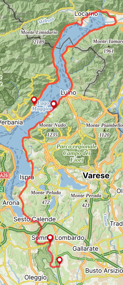 Pro jistotu jsem si dal dnes špunty do uší. To aby mě nerušila silnice dole pod kempem. Spalo se fajn, nechal jsem otevřený vrchní tropiko dokořán, takže ráno vše krásně suché. Nebyla ani zima. Sluníčko už už je po osmé hodině nad horami a láká mě vylézt ze stanu. Před odjezdem ještě přepírám ponožky, aby byly do letadla ne úplně out. V devět už šlapu směr Švýcarsko po levé, tedy západní, straně jezera Magiore. Cesta příjemně ubíhá a ani se nenaděju a jsem kousek před hranicí ve vesničce Cannobio. U silnice je pěkná kavárnička, tak tam před devátou snídám. Přejezd hranice se Švýcarskem je naprosto v pohodě. Pár celníků postává v obou směrech, ale žádný problém, jen pokynou ať pokračuju dál. Sluníčko od rána hezky hřeje, je 30°C a chtělo by to se někde zastavit a vykoupat. Projíždím Locarno, objíždím severní cíp Lago Magiore stáčím se zase zpět na jih směr Itálie. Kolem jedné hodiny projíždím kolem nádherné travnaté pláže s barem v San Nazzaro a mačkám brzdy. Krásně čistá voda 20°C osvěží a k obědu si dávám Cheeseburger a dvě Corony k tomu. Koupu se ještě jednou abych naakumuloval chlad a krásně osvěžený vyrážím dál.