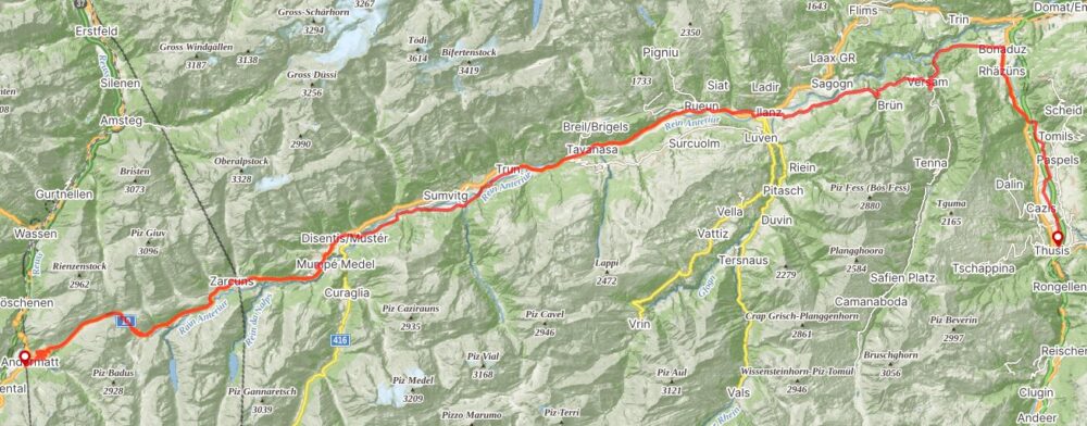 Ráno vstávám do krásného slunečného dne, ale od západu se to mračí. Všichni urychleně balíme a vyrážíme na cestu. V Coopu nakupuju dvě tyčinky ke snídani a grepový džus, ale než stačím nakoupit už prší. U odbočky na Oberal pass je kavárna. Stíhám ještě schovat kolo pod střechu a už leje. Podle radaru to je jen půlhodinová přeprška, takže akorát na kávu, čaj a čokoládový croissant. Nahoru je to jen 11 km, zpočátku serpentiny. Vjíždím do mraků a šplhám se nahoru kolem lyžařských vleků. Pak už se cesta troch zmírní a celkem rychle jsem nahoře na Oberal passu 2.044 mnm. Je tu větrno, ale jedno Panaché si dopřávám. Sjíždím serpentinami dolů a v Disentis / Mustér mě to stahuje na cyklostezku Brulf Cavardiras EV15 . Je to sice náročnější, ale projíždím bez dopravy pěknými vesničkami. V Trun už zase najíždím na silnici, po které šlapu až do Ilanz. Je už po třetí hodině a mám hlad, takže ideální volby je pizzerie ve městě hned u cesty. Mají výbornou salám / 4 sýry – hal bund halb, k tomu Panaché a sprite. Mám pitný deficit. Od rána mám v nohách 65 km a zbývá mi ještě 35. Z Ilanz zase odbočuju na vedlejší silnici cyklostezku EV15 a stoupám přes Castrisch, Valendas a Versam vysoko ve skalách s výhledy na řeku Rein Anteriur. Odsud je rychlý sjezd do Bonaduz, kde odbočuju jižním směrem na město Thusis . Napojuju se na Švýcarskou cyklotrasu č.6 a podél řeky Hinterrheim chvíli po silnici a zbytek po cyklo dojíždím do 12 km vzdáleného Thusisu. Před kempem je benzínka, tak doplňuju zásoby, vínko, bagetu a salám. Kemp je psaný bez restaurace, ale není to pravda. Restaurace je tu pěkná, budu ale večeřet z vlastních zásob. Chladím se jen jedním Paneché než se vyřídí ubytovací formality. Sprchy jsou parádní, teplá voda, dobíjím powerbanku, večeřím při hlaholu dětí u obíhačky a upíjím uspávadlo. Dnes mi kolem třetí hodiny volal pan Rakovan kvůli prohlídce vyhlídnutého Porsche v Düsseldorfu. Prohlídka dopadla na jedničku, nic zásadního, akorát bude potřeba vyměnit klimatizaci a udělat velký servis, za což jsem vyjednal s prodejcem slevu 500 Eur. Dnes platím zálohu a až se vrátím, tak asi pojedu vyzvednout nového miláčka. Také volala sestra Zuzana kvůli mámě. Prý se lékařům podařilo jí probudit z umělého spánku, ale má další komplikace s dvanácterníkem a jizvou. Snad to dopadne vše dopadne dobře a dostane se z toho. Stále na ní musím myslet, jak zanedbala svoje zdraví i přes naše dlouholeté naléhání.