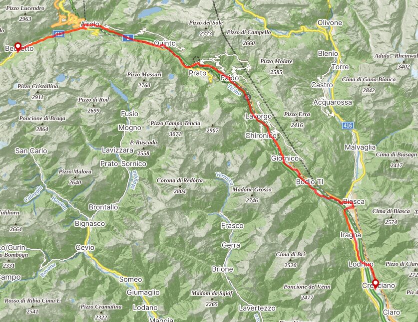 Ráno je vymetená obloha, dneska bude pařák. Vařím si citrónový čaj a přitom balím. Většina lidí v kempu má ve výbavě svítivá oranžová lana, helmy a neopreny. V další vesnici Lodrino se do řeky Fiumine Ticino, podél které jedu proti proudu, vlévá z horského masivu říčka Boggera, která umožňuje ve svém korytě provozovat adrenalinový sport canyoning. V kempu nic nenabízí, takže se přesouvám po cyklostezce mezi kukuřičnými políčky, které se postupně mění na vinnou révu až do Biasca. Tam zastavuju u kavárny a snídám croissant s espresem. Cesta vede stále mírným stoupáním. Větší sklon začíná až ve vesnici Giornico. Je potřeba vystoupat do dalšího údolí. Zleva mě obklopuje pohoří dvoutisícovek Valle Leventha a po cyklostezce č.3 stále podél říčky Ticino dojíždím v půl druhé do města Faido. Na náměstí se schovávám pod střechou restaurace a obracím do sebe hned tři Panaché a k tomu Panini s šunkou a sýrem. Tentokrát je křehoučká a moc dobrá. Z Faido to zase trochu stoupá a je vedro k padnutí. U každého pítka stavím strkám do vody hlavu a piju další a další litry vody. Cestou se dávám do řeči s několika cyklisty. Sdělujeme si naše plány a trasy odkud kdo jede. Poslední úsek před Airolo je po silnici a sklon se trochu zvedá. První otevřená kavýrna či hospoda je můj cíl a hasím hned žízeň citronádou. Kousek po cestě je Coop, musím dokoupit něco na večer, vypadá to, že budu spát mimo civilizaci. Kupuju půllitrové víno primitivo, grepový džus, ovoce na ráno, sardinky a žampionovou polévku v pytlíku. Dnes není nikde nablízku žádný kemp, tak aby bylo co jíst večer i ráno. Pouštím se na poslední úsek 9 km stoupání údolím Val Badretto ale než vyjedu z města zaujala mne řada restaurací. Mám výborný čas, je půl páté a na místě budu tak za hodinku max. za hodinku a půl, tak ještě stavím na polévku a Panaché. Polévka zeleninová, měla být krémová, ale skoro si myslím že mi dali minestrone. Nicméně neremcám, protože byla výborná. Teď už nasedám na kolo a šlapu poslední úsek stoupání po silnici, která je obklopena zalesněnými kopci. Projíždím vesničkou Fontana , míjím Badretto, jehož kostel je pěkně nasvícen zapadajícím sluncem. Těsně za Badretto přejíždím řeku do lesa, jak jsem si naplánoval. Je tu lavička s pítkem a krásné místo na spaní ale naproti je pár chat a u jedné z nich griluje rodinka na terase. Ptám se tedy, zda tu mohu v lese složit hlavu. Nic ptoti tomu nemají, ukazují mi, kde můžu postavit stan, že v pítku je pitná voda, a dokonce se ptají, zda s nimi nepovečeřím. S díky odmítám, mám vlastní zásoby. Stavím stan a jdu se umýt do řeky. Ticino je opravdu horská řeka, prudká, samá peřej. Pod mostem je úsek, kde se vrací voda, tak jen rychle namočit umýt, moc dlouho se to nedá vydržet, voda je jak žiletky. Na lavičce u lesa si vařím instantní kung pao, dojídám bagetu se sýrem a salámem a zapíjím to grepovým džusem a červeným Primitivem Salento 2022, které se mi zatím v pítku ochladilo na požadovanou teplotu.