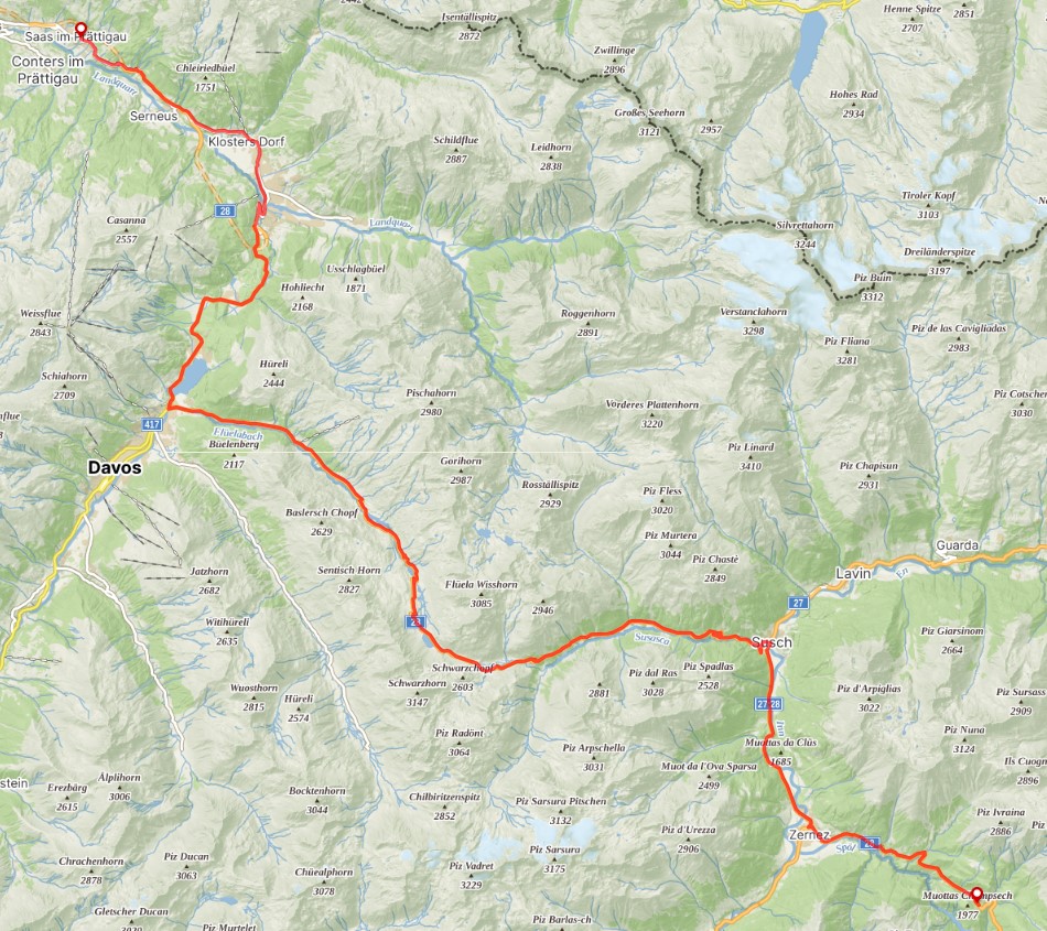 V devět jsem už na cestě. V baráku nikdo nebyl., tak nechávám 4Chf za pivo v pokoji na stole. Stavím až po 9 km v městečku Klosters Platz, kde to trochu žije. Je tu pár obchodů a krásné kavárny na snídani. Dvojité espresso, croissant, mrkvový dort a čaj je dobrá snídaně pro dnešní stoupání. To je dalších 7 km na Wolfgang pass v 1630 m. Před vrcholem začíná zase pršet. Sjíždím do Davosu a odbočuji na Flüela pass. Před stoupáním je tu Velo Chalet s příjemnou obsluhou. Čekám, než přejde déšť s radlerem a gulášovou polévkou k obědu. Dozvídám se zajímavou informaci, že ve Švýcarsku je nad 2000 m oficiálně povoleno kdekoliv stanovat. Šlapu na druhý dnešní kopec Flüella. Schází mi 800 výškových metrů, tak si je rozděluju po 300 m na malý odpočinek. Bohužel zase cestou nahoru začíná pršet.