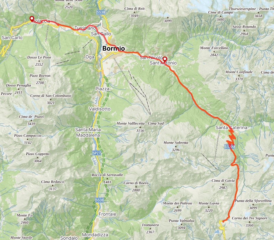 Snídaně v penzionu byla ucházející. Nic teplého, ale vše dobré včetně sladkých koláčků a koblížků. Vrážím před desátou, a nakonec beru všechny brašny sebou. Cestuju takto celou dobu, tak přeci nebudu cestu ulehčovat a člověk nikdy neví co se může přihodit. Nahoru je to 21 km. První zastávku dělám po 5 km, další po šesti, ale ještě se cestou zastavuju v Santa Catherina – lyžařském středisku v servisu kol. Potřebuju poštelovat přehazovačku, stále mi přeskakuje z předposledního kolečka a nemůžu na něj prakticky přehodit. Mechanik dal kolo na stojan, pootočil štelovacím šroubkem u páčky přehazovačky a bylo hotovo. Vůbec mě to nenapadlo, že to může být tak triviální závada. Cesta vede krásným údolím Valfurva a ze Santa Cateriny se trochu přiostřuje stoupání údolím Val di Gavia. Místy je úzká silnička bez patníků lemovaná smrkovým lesem, které přibližně ve dvou tisících metrech začnou nahrazovat modříny. O něco málo výše už mizí i ty a cesta pokračuje loukou či skalami porostlými trávou. Zdraví mě bučící krávy a svištící svišti. Naposledy zastavuji až 5 km pod vrcholem. Na chvíli si lehám do trávy a svačím broskve ze včera. Poslední úsek mezi skalami je zpočátku prudký, má 12 %, ale směrem k vrcholu se sklon narovnává.