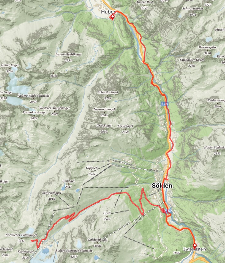 Budík řídím na osmou, ale nezvonil. Vstávám v devět. Věci v sušárně jsou jakž takž such. Balím stan. Naštěstí přestalo pršet a mraky místy ukazují nad horami modré nebe. Přesouvám se po cyklostezce hlubokým údolím Ötztal, podél řeky Ötztaler Ache přes pár vesniček až do Söldenu. V jedn otevřené restauraci snídám kávu a jablečný štrůdl s vanilkovou omáčkou. Moc dobrý, navíc obsluha j česká, což jsme navzájem poznali podle naší brilantní angličtiny s českými prvky. Za městem odbočuji na dnešní stoupání. Má sice jen 16 km ale zato pořádně prudké. Polovina kopce nespadne pod 11% a druhá polovina se v průměru šlape ve sklonu 13%. Kolem dokola je spousty downhillů a nespočet lidí jezdí nahoru lanovkami, někdo až na vrcholek Rotkogelu a sjíždějí pěkně upravenými tratěmi dolů do Söldenu. Já šlapu po silnici a koukám na ně přes zábradlí. Stoupání mi dává zabrat, od začátku jedu na nejlehčí převod a co 100 výškových metrů dělám malou pauzu na napití či snědení něčeho sladkého. Mám oči upřené na tachometr a počítám každý metr. Ve 2.140 m je restaurace Rettenbachalm, která se jmenuje podle údolí Rettenbachtal kterým stoupám, stejně jako říčka vytékající z ledovce Retenbach ferner, kde chvíli odpočívám u Almdudlera. Odsud se právě stoupání přiostřuje na 13%, místama mi tachometr ukazuje i 16%. Tady se také ztrácejí lesy a kolem jsou už jen louky a okolní vysoké třítisícovky. Vpředu je vidět ledovec, kam mám namířeno. Míjím opuštěné restaurace a horská střediska. Posledními dvěma zatáčkami se dostávám skoro až na úroveň ledovce do 2.800 mnm. Píšou tu, že je to nejvyšší silnice v EU 2.798,16m. Smyčka kolem Cima de La Bonette je ve výšce 2.802m, takže tu pár metrů nehraje. Nahoře jem až po 6 hodinách stoupání v 17:30. Popojíždím až na vrchol parkoviště, kde se dostávám do 2.800 m a začíná pršet. Z ledovce sálá pořádná zima, jsou č stupně a spolu s větrem a deštěm se do mě dává pořádná zima Na bundu dávám ještě nepromok a rychle dolů stejnou cestou. Silnice tu končí, pass to tentokrát není. Kolo moc nebrzdí, brzdy jsou mokré a ruce úplně zmrzlé. Pršet přestává až zase v polovině kopce. Chvilku odpočívám. Dojídám poslední řízek co jsem dostal od Peti sebou. Navlékám na sebe ještě pod obě bundy mikinu. Po pár kilometrech a zatáčkách jsem zase na konci Söldenu a do mého cílového městečka Zwieselstein to mám jenom 2,5km s malým převýšením. Za pár minut už na recepci hotelu Neue Post fasuju klíče od pokoje, cvičím a jdu se ohřát do sprchy. Chci jít na večeři, ale nemůžu najít taštičku s hygienou. Není nikde, asi jsem ji nechal ráno v kempu, když jsem se převlékal v sušárně nebo v koupelně. Recepční je tak hodný, že tam volá aby se německy domluvil. Dokonce se dovolal a vysvětluje co se stalo. Paní z campu, říká že se podívá a zavolá zpátky. Nezavolala a ani už to nezvedla. Zítra ráno tam budu muset zajet zpátky, mám tam vše potřebné pro hygienu vč. prášků na tlak. Naštěstí je to jen 30 min. autobusem. Ráno si přivstanu a pojedu ještě před snídaní. Jdu na večeři. Almdudler, k tomu suché červené a panenku s omáčkou z lišek. Vaří tu moc dobře. Je skoro deset, tak jdu do postele, ráno v sedm chci stihnout bus.