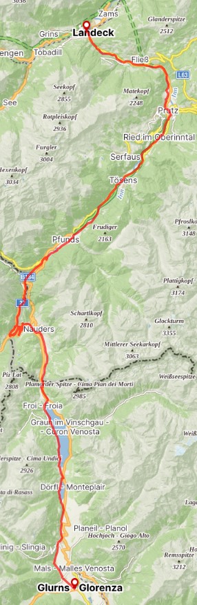 Kousíček za městem stavím u restaurace a dopřávám so vrcholový Aperol. Dokonce jsem dostal i misku chipsů. Odsud sjíždím přes Italsko Rakouskou hranici do Nauders, odkud mě čeká ještě jedno mini stoupání na Nortbertshöhe v 1.405 m a pak šup dolů do Martina, Rakousko – Švýcarskou hranici. Nahoře začíná fest pršet a vydrží to další hodinku. Z Martina, jedu částečně po silnici, částečně po šotolině podél řeky Inn údolím Oberes Gericht po Švýcarské straně až k hraničnímu přechodu Schalkl. Kousek odsud sjíždím k Innu na Rakouskoučást cyklostezky Via Claudia Augusta – Innradwer Tiroler Oberland, která vede podél Innu do Landecku. Na chvíli přestává pršet, ale jen do chvíle než se mi usuší věci. Tachometr na kole se mi úplně zamlžil. Chci se zastavit někde na polévku. Všude zavřeno až v malé vesničce Tösens Tschupbach v největším lijáku je otevřená restaurace. Parkuju kolo v garáži, objednávám rádlera a chci polévku. Nevaříme až v šest hodin. Kuchyně je od dvou zavřená, usmívá se na mne obsluhující pán. Blbci, vždyť by stačilo ohřát jedu porci již připravené polévky. Piju rychle pivko a dojídám poslední fit tyčinku. Alespoň přestalo pršet. Frčím dál přes Tösens, kde mají stejný přístup až do Ried im Oberinntal. Tam to vypadá slibně a polévka rajská krémová a dětská pizza salami okořeněná chilli olejem a k tomu čaj s citrónem není problém. Jde o přístup lidí, tuhle restauraci Alpen Restaurant mají pod palcem dva Indové.