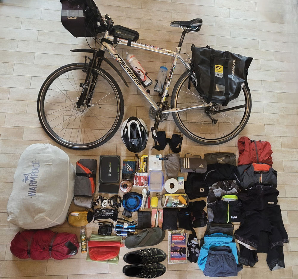 Vše se mi tam s rezervou vejde. V jedné brašně mám obvykle nářadí, toaleťák, spacák, karimatku a vařič s bombou. Ostatní je v brašně druhé. Na řídítkách vozím foťák, solární nabíječku, notýsek tužky, mapy, peněženku, hroznový cukr, krém na opalování, nabíječku, nůž a mobil.