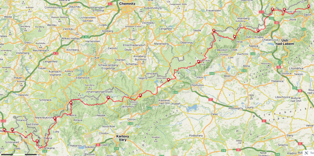 V tomto roce jsem v červnu absolvoval první operaci ploténky, musel jsem vynechat kolo výlet, tak jsem se rozhodl, že si projdu Česko, které už mám projeté na kole, pěšky. Přečetl jsem spousty knížek o Pacifická hřebenovce a toto je její Česká verze – Stezka Českem, kterou dal dohromady a dále rozvíjí Martin Ubl. Není tak dlouhá, jako její Americká kamarádka, ale je krásnou Česko přírodou a máme ji za rohem. První část kterou jsem prošel za 15 dní z nejvýchodnějšího bodu (vlastně z Rehau) do Děčína, přes Krušné Hory a Děčínský Sněžník měla celkem 317 km.